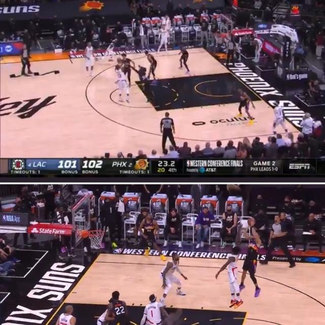 布克暂停后接球命中了一记精彩的滞空跳投之后,快船暂停回来之后,乔治持球单挑克劳德中投回应中投,再次反超比分。