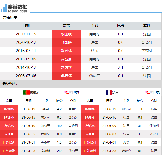 双方近6次交手,葡萄牙2平4负,未尝胜绩!葡萄牙各项赛事近6场比赛,3胜2平1负,面对德国和西班牙两支球队未尝胜绩;法国各项赛事近6场比赛,5胜1平,保持不败,球队攻坚战仍是德尚需要解决的难题。