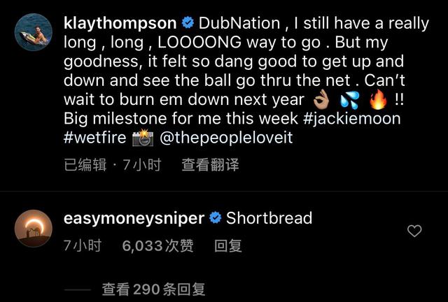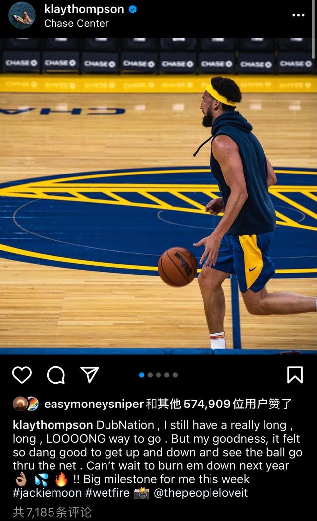 由此可见,重回训练场对于克莱的意义有多么重大。他的前队友,现篮网当家球星杜兰特现身点赞了该条社媒动态,并在底下打趣留言“酥饼”,仿佛在调侃克莱的射程相比以前短了。据他的好队友库里所说,这是克莱在勇士队中的一个惯用词,每当他看见有人将球砸在前框上,就会打趣地说出这个词语。