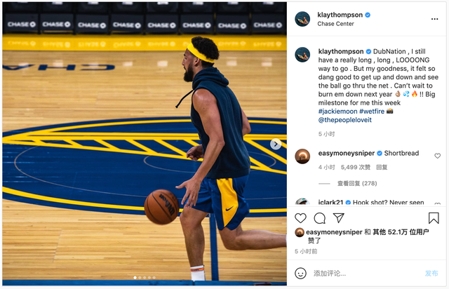 最后需要谈及的是,克莱-汤普森在自己IG上晒出自己重返球场训练并且写道:“我还有很长很长的路要走,我的天哪,站起来看着篮球穿过篮网的感觉真的太棒了,等不及明年了,本周对我来说是非常重要的里程碑。”