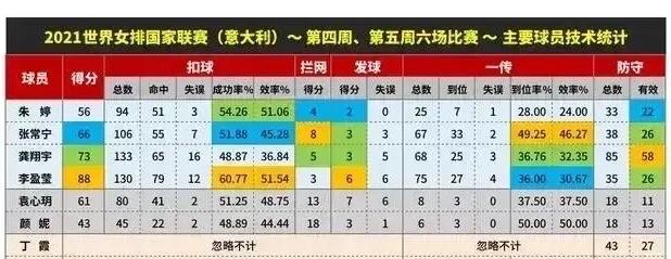 张常宁105扣54中,7失误被拦,成功率54%,效率45%,8拦3发,共计66分;龚翔宇133扣65中,15失误被拦,成功率49%,效率38%,5拦3发,共计73分。