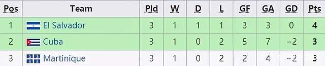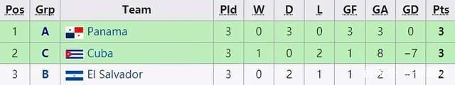 在3位小组第3的比拼中,尽管古巴队在小组赛中仅仅打入1球,却整整丢了8个球,但凭借着末轮艰难拿下的3分,还是以1分优势力压萨尔瓦多成功出线。