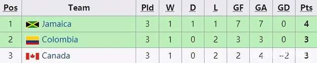 在3支小组第3球队的比拼中,小组赛拿到4分的牙买加确定晋级,哥伦比亚与加拿大在小组赛中都拿到3分,但哥伦比亚最终凭借着净胜球优势晋级淘汰赛。
