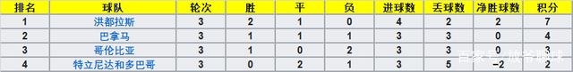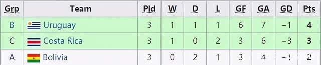 在3位小组第3的比拼中,哥斯达黎加以1胜2负积3分的成绩排名第2,力压A组第3玻利维亚跻身淘汰赛。