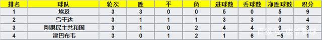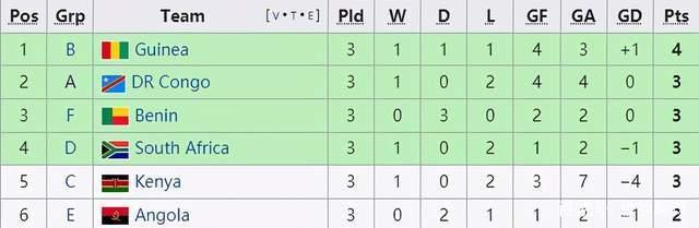 在6支小组第3球队的竞争中,刚果队与贝宁、南非以及肯尼亚同积3分,其中刚果与贝宁的净胜球较之南非与肯尼亚更有优势,而刚果的进球数又比贝宁多两个,就这样,小组赛前两轮全败的刚果意外的成为了成绩第二好的小组第3球队,顺利晋级16强。