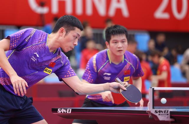 6月23日,中国一团选手许昕(左)/樊振东在第三轮双打比赛中以3比0战胜中国二团选手梁靖崑/林诗栋。最终,中国一团以4比1取胜。新华社发(中国乒协供图)