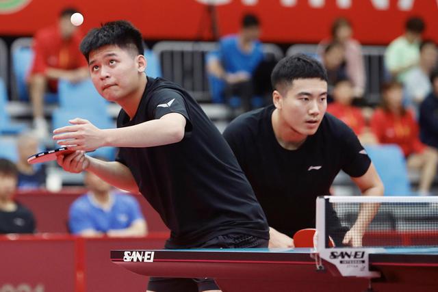 6月23日,中国二团选手梁靖崑/林诗栋(左)在第三轮双打比赛中以0比3负于中国一团选手许昕/樊振东。新华社发(中国乒协供图)