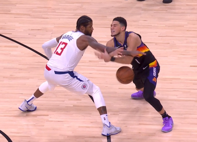 后者行进间右肘挥到黑贝嘴上被判进攻犯规,夺回球权的快船回头就又造成布克的一次防守犯规,乔治站上罚球线将分差缩小到1。