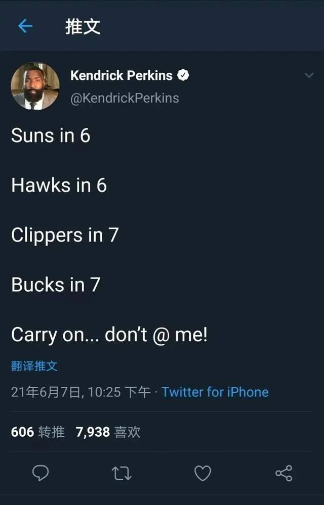 不过即便如此,帕金斯还是考虑到了种种可能会发生的情况,在半决赛开始之前就预测到了最终能够晋级东西部决赛的球队。而现在他又预测雄鹿队将会击败老鹰队,并且会在6场比赛之内结束战斗。帕金斯表示:“今年的季后赛其实我一直非常看好老鹰队,此前我也说过特雷杨已经证明自己就是超级巨星了,但是任何好事都有结束的那一刻,他们的好事看来应该也是到头了,雄鹿队会在六场之内晋级,老鹰队应该是没有机会了。”