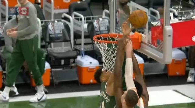 卡佩拉在篮下进攻,先是被大洛从身后帽掉,他再次取得球权,欲扣篮,这次是被字母哥无情拒绝。