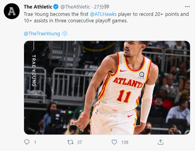 此外,在本场交出48分11助攻之后,特雷杨已经连续三场季后赛,至少交出20分和10次助攻。