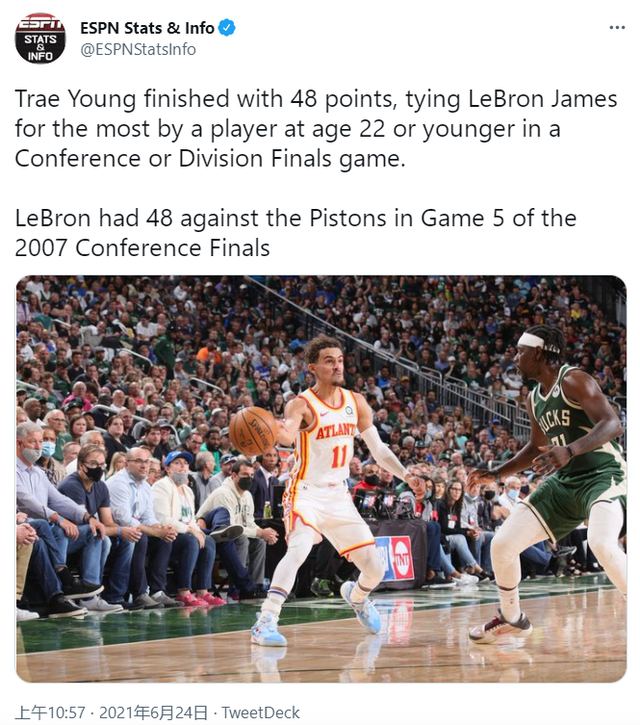而全场砍下48分,也让特雷杨再次比肩詹姆斯,成为22岁及以下,在分区决赛单场交出最高分的球员。