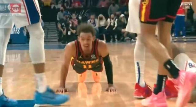 次轮对阵76人的G7第二节,特雷-杨造成了霍华德的追尾犯规,倒地起身前,连续做俯卧撑完成装X。