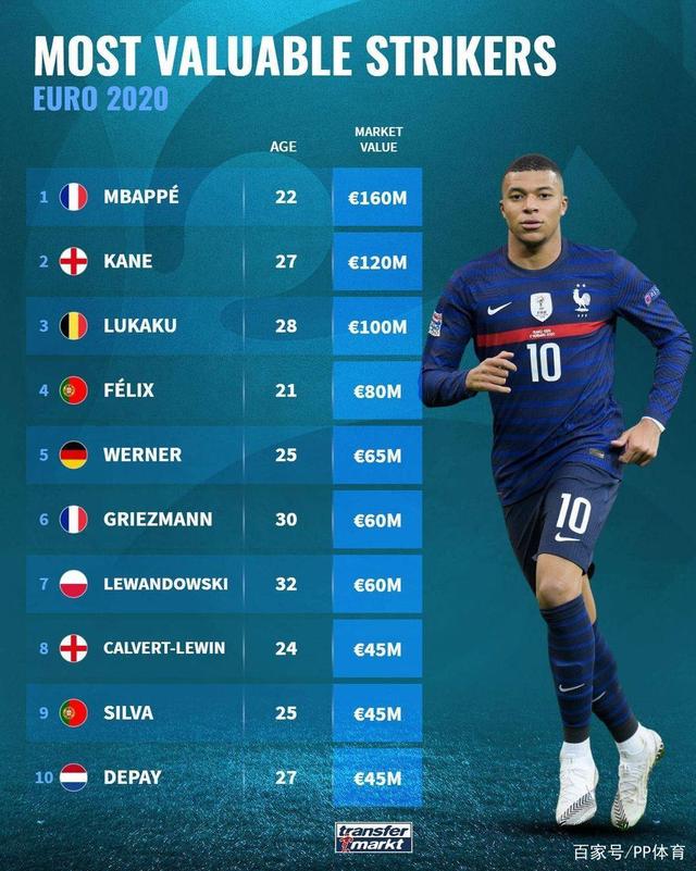 德国转会市场网站盘点了本届欧洲杯的前锋身价榜,法国球星姆巴佩以1.6亿欧居首,凯恩和卢卡库分列二、三位。