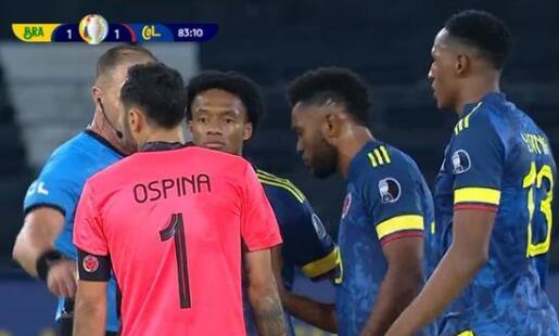 随后在巴西与哥伦比亚的比赛中,虽然巴西2-1绝杀哥伦比亚,但哥伦比亚在开场第10分钟就打入一粒漂亮的倒钩进球,终结了巴西各项赛事490分钟不失球纪录。直到第78分钟,巴西才扳平比分。这粒进球颇具争议,因为进球前,皮球曾碰到主裁判,又弹到巴西人脚下,等于是主裁判间接“策动”了巴西的进球。当时就引发哥伦比亚球员的抗议,比赛因此中断了将近10分钟。