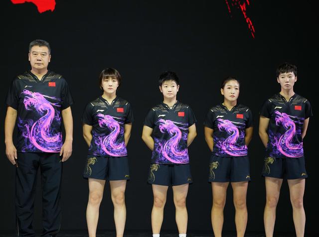 6月23日,中国乒乓球女队主教练李隼、队员陈梦、孙颖莎、刘诗雯、王曼昱(从左至右)在展示全新战袍。新华社记者朱峥摄