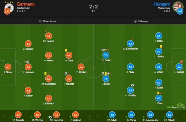 直播吧6月24日讯 在刚刚结束的一场欧洲杯F组小组赛,德国2比2战平匈牙利。小组第二出线。在whoscored的赛后评分里,胡梅尔斯中框+助攻8.4全场最高,格雷茨卡替补建功7.2。