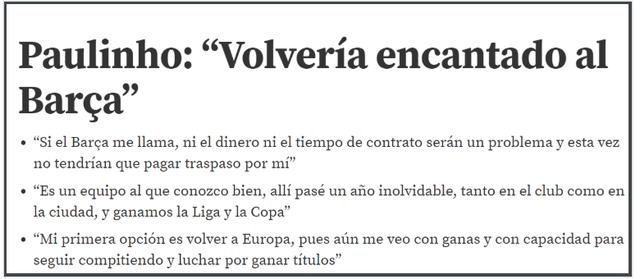 虽然,此后广州恒大又加价把保利尼奥回购回中超。但是,保利尼奥似乎仍然对那个美好的赛季念念不忘。在刚刚与广州队友好解约之后,保利尼奥接受了《世界体育报》的专访。在被问到巴萨目前正在寻找一名中超球员,但目标球员维纳尔杜姆却选择了大巴黎时。保利尼奥表示如果巴萨再给我一次机会的话,我会很高兴。