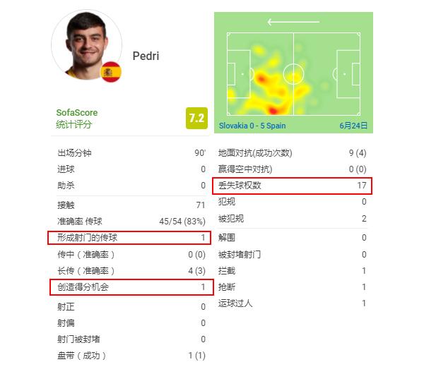 佩德里被很多人称之为伊涅斯塔接班人,是因为他的原地控球和摆脱技术,以及出脚的精度。不过在传球的准确率和对失误的控制方面,18岁的佩德里还是很青涩。本场他策动了本方的2个进球,同时还送出1脚关键传球,还有1次绝佳得分机会。但是佩德里作为技术型中场,本场17次丢失球权还是偏高了。