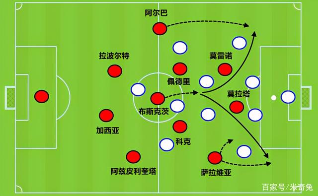 佩德里与布斯克茨可谓是天作之合,原因主要有两点:第一是从佩德里的角度,他的身体素质当前还是偏差一些,毕竟只有18岁。进入前场30米区域,如果整体节奏偏快,佩德里的失误率会大大提升。布斯克茨的优势在于他除了传球这一下很快,之前的控球时间可以相对延长,将整个节奏缓下来,成功掩盖佩德里的劣势。第二点是从布斯克茨的角度看,他还拥有腿长和一定的力量优势,但是转身偏慢。佩德里擅长选位和预判,以及有着很强的出脚频率。所以两人相结合,攻防逻辑就都理顺了。