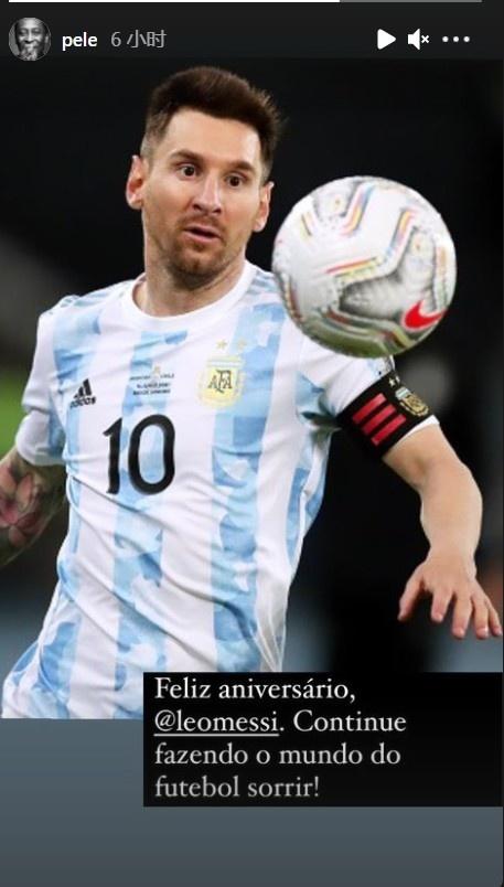 贝利在个人Instagram动态上晒出梅西的一张照片,并写道:“祝梅西生日快乐,希望你继续让足球世界变得更美好!”