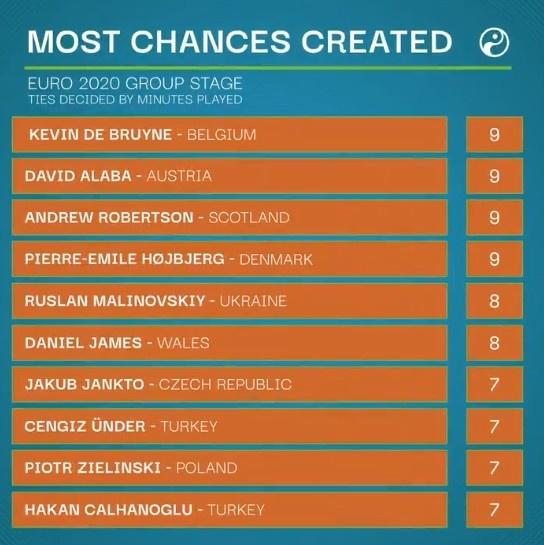 直播吧6月25日讯 2020欧洲杯小组赛阶段的比赛结束,足球数据媒体Squawka统计了本届欧洲杯小组赛阶段球员创造机会数排行,小组赛3场只踢了一场半的比利时中场德布劳内创造9次机会,与阿拉巴、罗伯逊和霍伊别尔并列榜首。