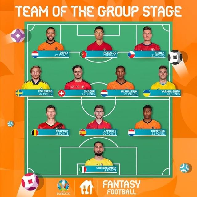 直播吧6月25日讯 欧洲杯小组赛已于昨天凌晨全部战罢,小组赛阶段的最佳阵容也已评选完毕。其中C罗获得29分的最高分,荷兰队有三人入选最佳阵。