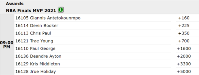 最新的总决赛MVP赔率方面,字母哥毫无疑问的排名第一位,不过他要先带队进入总决赛,布克和保罗紧随其后,现在太阳有更大的机会,特雷杨已经上升到第四位,他带领老鹰势头不错。乔治、艾顿、米德尔顿、霍勒迪也进入榜单,现在来看,雄鹿和太阳还是更被看好。