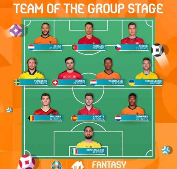 在今夏欧洲杯毫无疑问是所有球迷关注的焦点,如今三轮小组赛全部战罢,虽然有些豪门球队小组赛的表现不尽如人意,但是所有传统强队都系数闯入到了十六强当中,那么哪些球员能够凭借出色的个人表现成功入选小组赛最佳阵容,就成为了众多球迷关注的焦点!欧足联在官方网站公布了最佳阵容,其中葡萄牙球星C罗以29分的最高评分领衔,捷克前锋希克、荷兰前锋德佩和总裁一起成为了最佳阵容的进攻三叉戟,而在中场位置的四名球员分别是乌克兰的亚尔莫连科、荷兰的维纳尔杜姆、瑞士的沙奇里和瑞典的福斯贝里,后防线则由荷兰的邓弗里斯、西班牙的拉波尔特和比利时的穆尼耶组成,意大利国门多纳鲁马毫无悬念拿下了最佳门将,在这份榜单的当中卫冕之王荷兰成为了最大赢家,他们有三名球员成功入选,而被视为争冠大热门的法国队则成为了最失意的球队,他们没有一名球员入选了小组赛最佳阵容!
