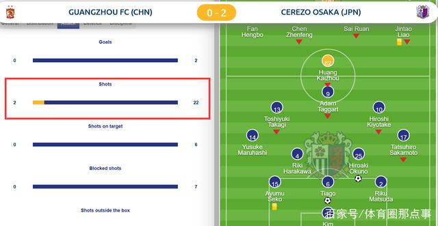 全场比赛,广州队射门只有2次,大阪樱花达到了22次,广州队可谓是被吊打!当然,从两队的阵容看,广州队0-2输球不丢人,但也不是虽败犹荣:除了在进攻上基本上没有亮点之外,也要承认,大阪樱花很菜,他们在联赛的排名不是很高,更重要的是,这场球,大阪樱花进攻上把握机会能力很差、效率很低,如果再高一点,广州队恐怕早就被打花了。