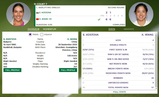而当天出战女单资格赛第二轮的中国小花王欣瑜也取得了胜利,她以6-2/6-1轻取保加利亚人科斯托娃,强势晋级决胜轮。另一朵小花王曦雨则以6-7(5)/3-6不敌西班牙人迪亚兹,无缘决胜轮。