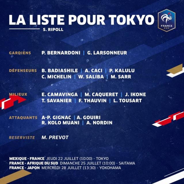 直播吧6月25日讯 今日,法国国家队官方公布了东京奥运会的18人大名单和一名候补球员。此前,法国队与日本、南非、墨西哥分到同组。