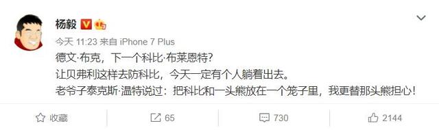 今天比赛结束后,国内几位名嘴也纷纷发表了自己的观点,杨毅提到了科比,他表示:“德文·布克,下一个科比·布莱恩特?让贝弗利这样去防科比,今天一定有个人躺着出去。老爷子泰克斯·温特说过:把科比和一头熊放在一个笼子里,我更替那头熊担心! ”