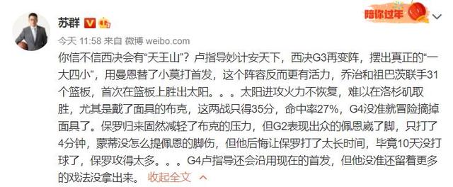 苏群看完今天的比赛后也谈到了自己的看法,由于篇幅较长,我简单概括一下苏群的观点。苏群首先给出了自己的预测,他认为太阳和快船会相约天王山大战。然后他给出了自己对于本场比赛的看法,他认为快船今天赢球,卢指导功不可没,正是卢指导的变阵起到了改变比赛走势的效果。