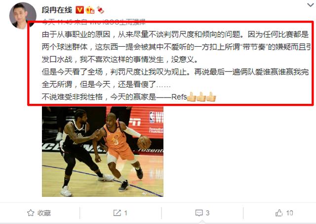 甚至于,连此前都不怎么出声的名嘴段冉,赛后也是憋不住了,他直言,“由于从事职业的原因,从来尽量不谈判罚尺度和倾向的问题。因为任何比赛都是两个球迷群体,这东西一提会被其中不爱听的一方扣上所谓‘带节奏’的嫌疑而且引发口水战,我不喜欢这样的事情发生,没意义。但是今天看了全场,判罚尺度让我叹为观止。再说最后一遍俩队爱谁赢谁赢我完全无所谓,但是今天,还是看傻了……不说难受非我性格,今天的赢家是——Refs。”