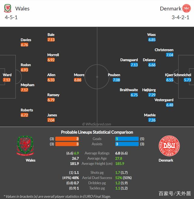 威尔士主打4-5-1,丹麦主打3-4-2-1,球员方面,丹麦队克亚尔伤疑,威尔士队阿姆帕杜红牌停赛。