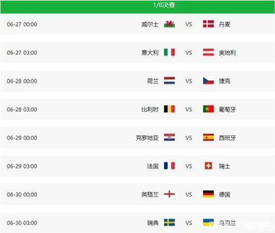 威尔士VS丹麦来看,看好丹麦;意大利VS奥地利,意大利大概率晋级;荷兰和捷克,好看荷兰;比利时和葡萄牙,还是看好比利时;克罗地亚VS西班牙,大概率西班牙晋级;法国和瑞士,法国几率大;英格兰和德国,看好德国;瑞典和乌克兰,大概率瑞典晋级。
