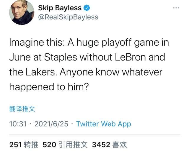 美国当地的著名詹黑skip就一直抓着这一点不放,当他看着快船在斯台普斯球馆拿下了队史第一次西决季后赛胜利之后,他更加是忍不住自己想要黑詹姆斯的冲动了。skip在社交媒体上发布了一个问题,而其中则是十分阴阳怪气地问起了詹姆斯的情况。skip说六月的斯台普斯中心没有了詹姆斯盒湖人,任何重要比赛都看不到他们的影子,谁知道他们发生了什么事吗?