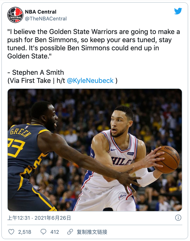 关于西蒙斯被送到勇士确实是非常有趣的想法, 当然目前并没有任何明确报价。