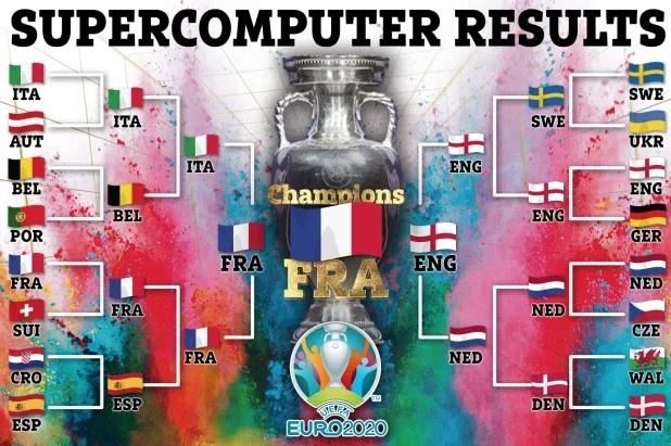 超算预测比利时将会击败葡萄牙,但之后输给意大利无缘四强;英格兰击败德国、瑞典、荷兰挺进决赛;意大利击败奥地利和比利时进入四强;荷兰击败捷克和丹麦进入半决赛后不敌英格兰;法国击败瑞士、西班牙之后,决赛击败英格兰,赢下本届欧洲杯。