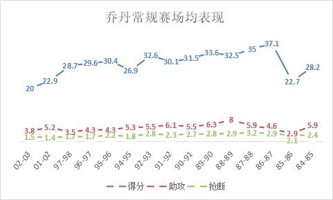 新秀赛季,乔丹场均28.2分5.9助攻6.5篮板2.4抢断,拿下最佳新秀,又首发出战全明星,还入选了最佳阵容第二阵容,刚刚入行的乔丹就成为了人们的宠儿,但第二个赛季,乔丹因左脚的一块骨头骨折而伤伤退,常规赛只出战了18场比赛,但乔丹在季后赛归来,就在凯尔特人面前砍下了63分,打破了NBA季后赛的得分纪录,让伯德等巨星都惊讶于乔丹的个人表现。