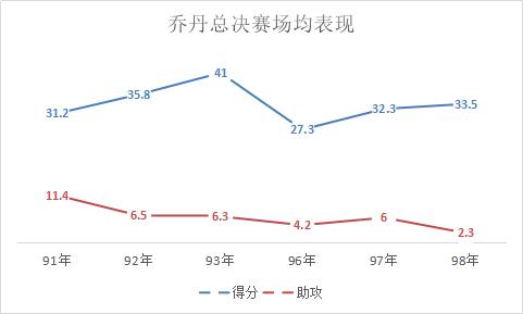 作为公牛的领袖,乔丹当然是所有人针对的重点,但他的锋芒仍无法阻挡,首轮第三场,乔丹56分率队晋级,次轮抢七,乔丹42分率队晋级,东决第五场,乔丹29分8助攻8篮板,率队闯进总决赛。总决赛中,面对球风同样华丽,仅次于自己的“滑翔机”德雷克斯勒,乔丹交出场均交出35.8分4.8篮板6.5助攻1.7抢断的表现,率队卫冕总冠军,自己蝉联FMVP,乔丹在联盟一日,其他人就只能是第二分卫。