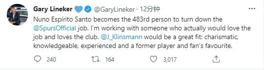 莱因克尔在社交媒体上写道:“努诺成为第483位拒绝热刺帅位的教练。我正在和一个真正热爱这份工作和这家俱乐部的人共事,克林斯曼非常适合担任热刺主帅——他有魅力、有知识、有经验,曾效力于热刺并且是球迷的最爱。”