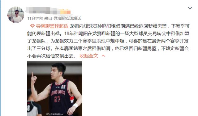 北京时间6月28日,根据国内媒体的爆料,此前租借到广州男篮效力的孙鸣阳已经是确定离开球队,下一步重返新疆男篮。