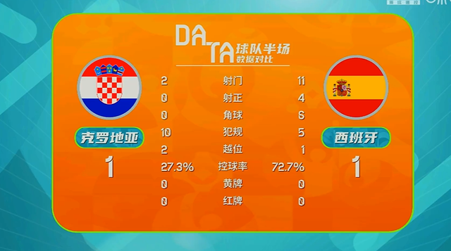 从半场数据来看,西班牙的控球率高达72.7%,射门达到11次,其中4次射正。而克罗地亚只有2次射门,没有任何一次打在球门范围内。