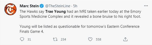 在6月29日,NBA记者马克-斯坦恩报道,特雷杨已经接受了核磁共振的检查,他的右脚遭遇了骨头挫伤,他在东决G5中的出战状态是存疑。这不是单纯的组织扭伤而是骨头有伤,这对于特雷杨的移动会有很大影响。