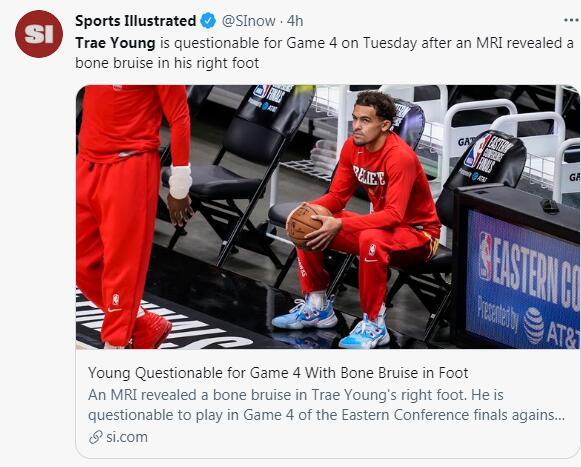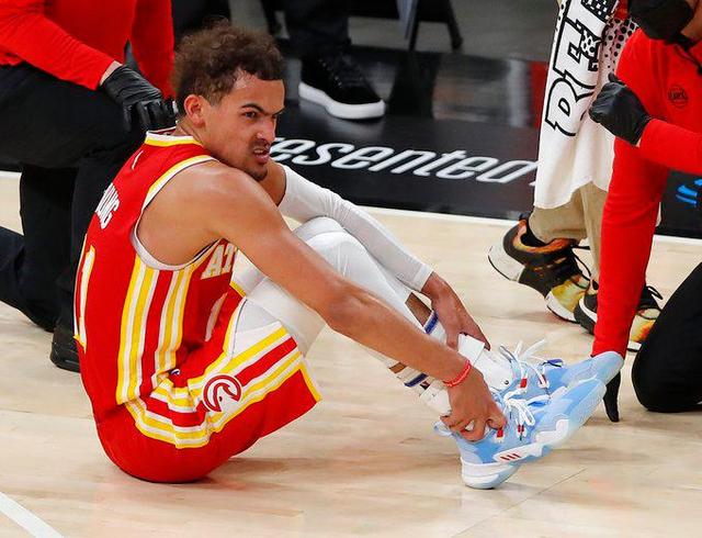 老鹰球员特雷杨在6月28日对阵雄鹿的G3中不慎扭伤了脚踝,在第三节还剩29.3秒,特雷杨往后蹬发力的时候踩到了界外的裁判,这一步让特雷杨直接疼痛倒地随后他进入了更衣室,虽然末节回归但移动明显受限只有4中1,球队也因此被逆转。