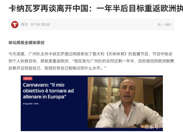 在昨天广州队0:1输给了中国香港球队,以4连败出局,无缘亚冠淘汰赛。这个比赛并不是由卡纳瓦罗带队的,而是由助理教练带队,但在深夜最新接受意大利媒体采访之时,卡纳瓦罗正式官方宣布了自己离开广州恒大的时间。