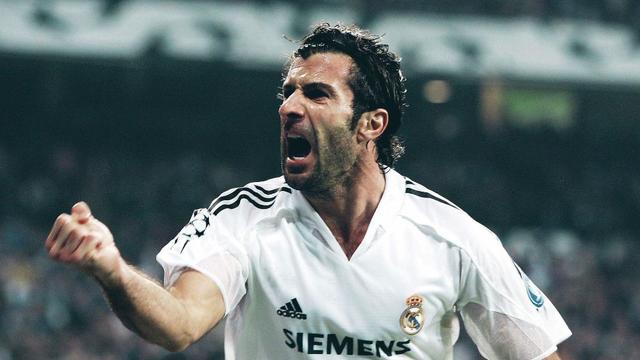 2000年7月由于赛场外一系列因素,菲戈做出了一个轰动世界的决定:以5610万美元的当时世界第一身价转会到死敌皇家马德里,著名的“扔猪头”事件也因此而诞生。转会至皇家马德里不久,菲戈就帮助球队获得丰田杯和超级杯,并在加盟皇马的首个赛季就帮助球队夺得阔别四年之久的西甲冠军。因为这爆炸性的人气和出色的表现,菲戈击败了劳尔和贝克汉姆当选2001年世界足球先生。随后一个赛季,菲戈还和队友们一起在欧冠决赛中击败勒沃库森,为皇马赢得了第九座欧冠奖杯。美中不足的是在同年的韩日世界杯上,时隔16年后重新杀进世界杯的葡萄牙在小组赛中1胜2负爆冷出局;而2004年欧洲杯菲戈虽然带领葡萄牙队从世界杯的噩梦中解脱出来一举打入决赛,但决赛中却输给了希腊,使葡萄牙成为了欧洲杯历史上首支东道主进入决赛实力的球队,也成就了希腊神话。只能说对于菲戈而言,俱乐部和国家队不能两者兼得。