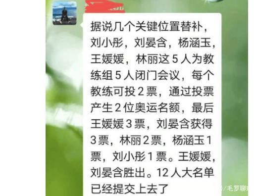 今天有一些知情的网友,包括媒体人在社交媒体上爆料说,现在中国女排已经是采用了类似于中国乒乓球队的办法,效仿刘国梁此前执行的办法,用内部投票的方式来决定其他几个位置的人员的产生,这也看得出来,事情可能会非常麻烦,最终三个离队的名额非常难产,因为中国女排现在是一个15选12的状况,要淘汰掉三个人。据说进行最终的投票,产生的结果是这样的,以郎平为首的5名教练来进行投票,结果王媛媛得了3票,然后刘晏含也得到了3票,她们两个人就成功地搭上了末班车,而另外三个人,奥运冠军林莉只拿到2票,另外刘晓彤只拿到1票,还有杨涵玉据说也只拿到了1票。